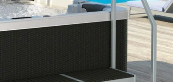 En bois de synthèse et à structure aluminium, esthétique et imputrescible, l’escalier ainsi que sa rampe permettent d’accéder facilement au spa. Le banc est idéal pour y déposer les serviettes de bain. Coloris cerisier ou gris foncé. Cette option n’est pas disponible sur le R200.